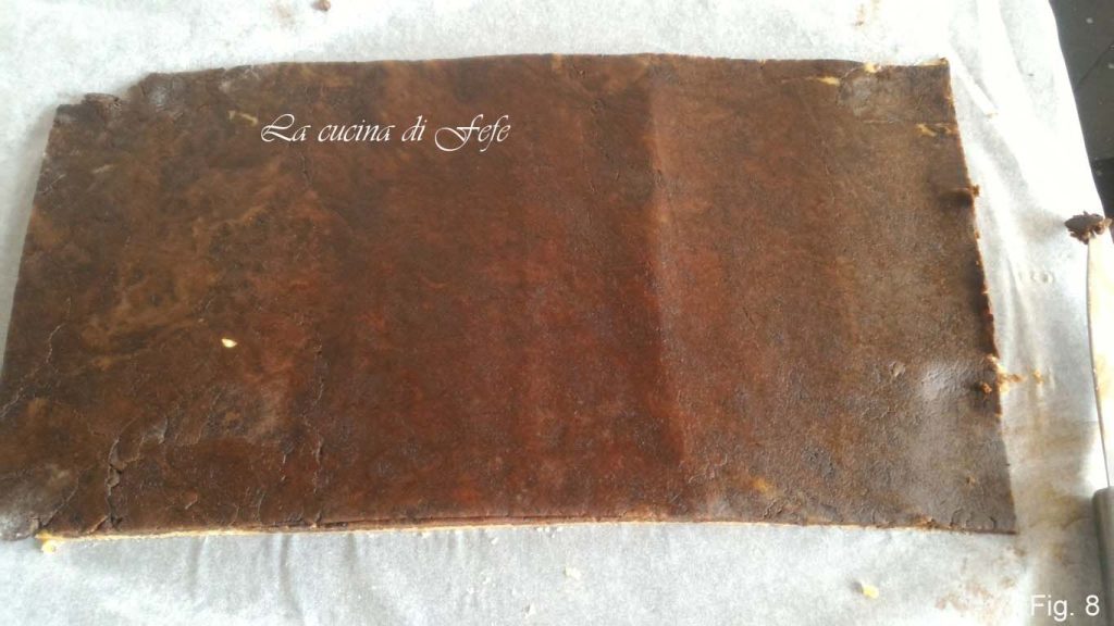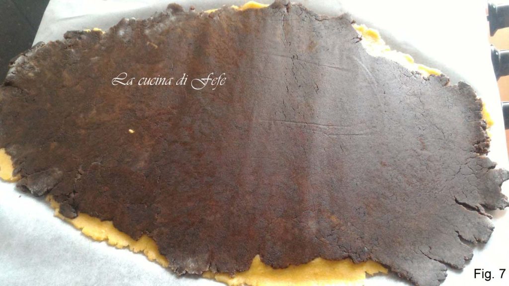 Haz lo mismo con la segunda masa. Pincela la superficie de la primera con agua, de modo que actúe como pegamento, luego transfiere también la de cacao superponiéndola a la neutra, tratando de hacerlas adherir bien.