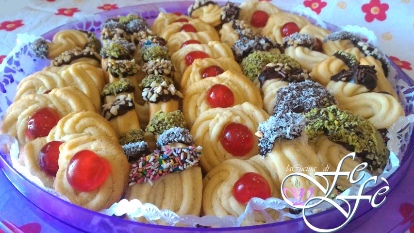Para obtener galletas con una forma perfecta y regular, el consejo es utilizar una sac-à-poche con punta de estrella. La paciencia y la precisión son fundamentales: si tienes ayuda en la cocina, como me ocurrió a mí, el trabajo se volverá aún más placentero y el resultado final será impecable. ¡Estas galletas irán literalmente volando! Te aconsejo por eso duplicar siempre las dosis, ya que la ventaja es que se conservan muy bien durante varios días en una caja de lata, manteniendo intacta su fragancia. Un agradecimiento especial a mi esposo por el valioso y paciente apoyo en la cocina, sin el cual estas galletas no habrían sido tan bonitas y buenas!