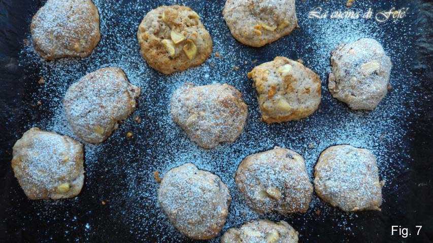 • Pon a hornear en el horno precalentado a 190°C durante unos 18′-20′, contrólalos después de los primeros 15′ y apaga antes de que alcancen un dorado excesivo. Hornea y deja enfriar en una rejilla, luego espolvorea con azúcar glas a gusto (fig. 7).