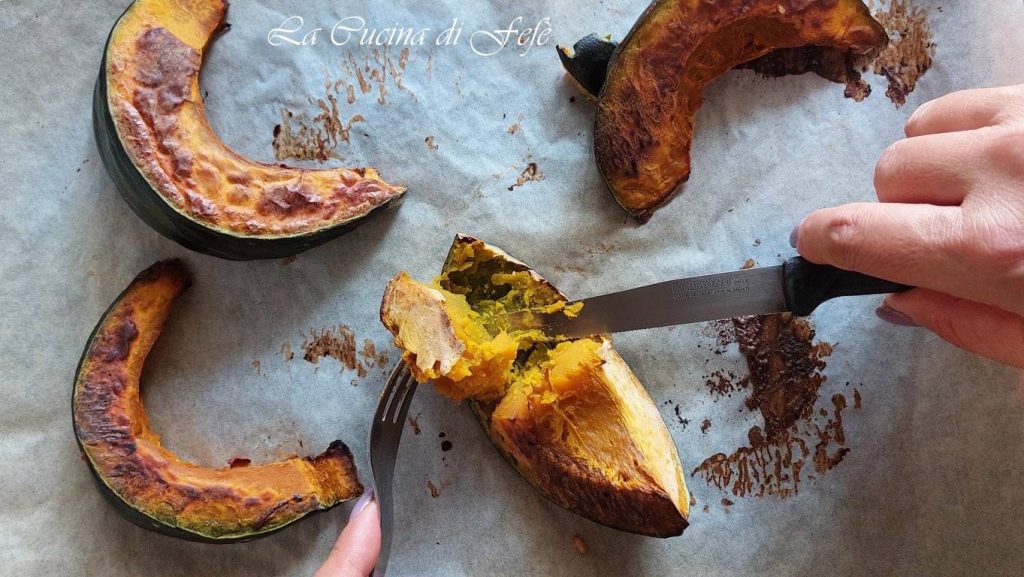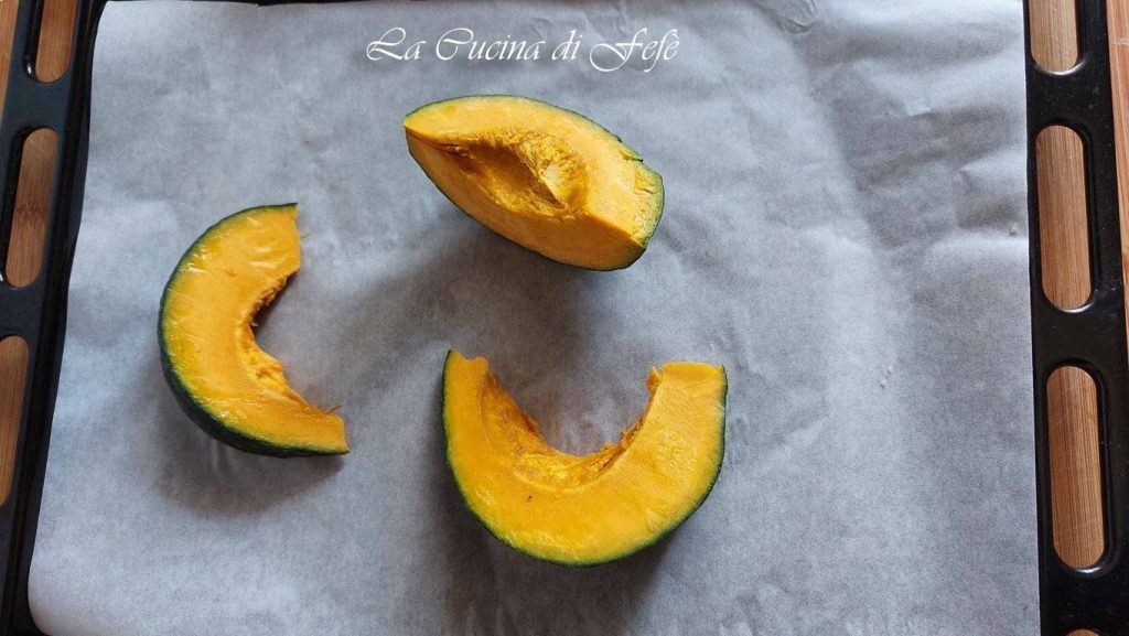 Coloca las rodajas de calabaza limpias con toda la piel en una bandeja forrada con papel de horno y pon a cocer en horno estático precalentado a 190°C durante 20′, luego gíralas y continúa la cocción durante otros 10′.*