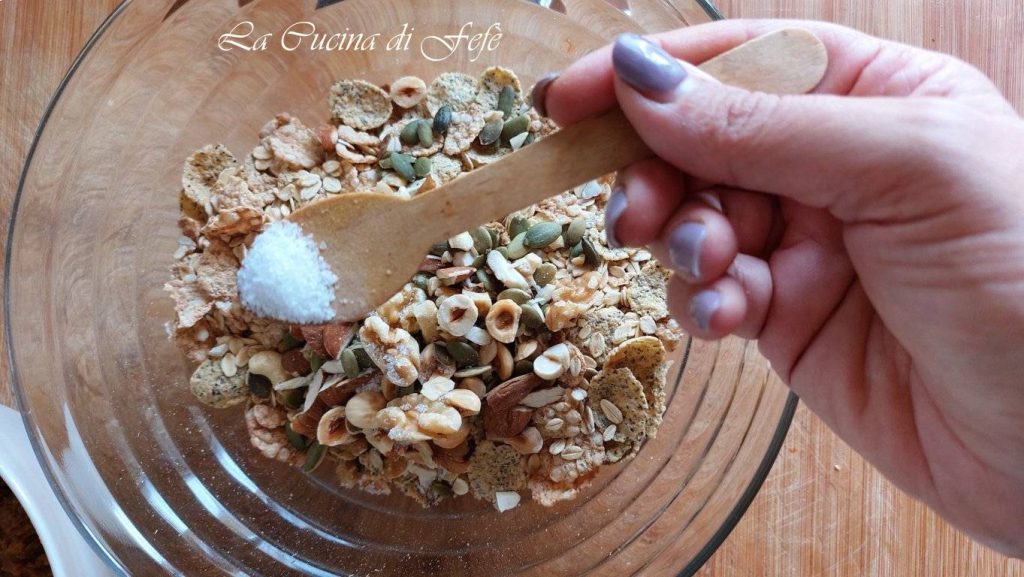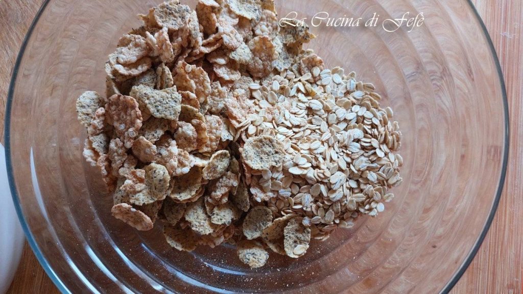 Transfiere la granola a una bandeja forrada con papel de horno, formando una sola capa y compactando con una cuchara. Pon en un horno ventilado caliente a 170°C durante 25′. Pasado este tiempo, mezcla suavemente con una espátula para girarla sin desmenuzarla demasiado, vuelve a meterla en el horno siempre ventilado bajando la temperatura a 160°C y continúa la cocción durante otros 10′.