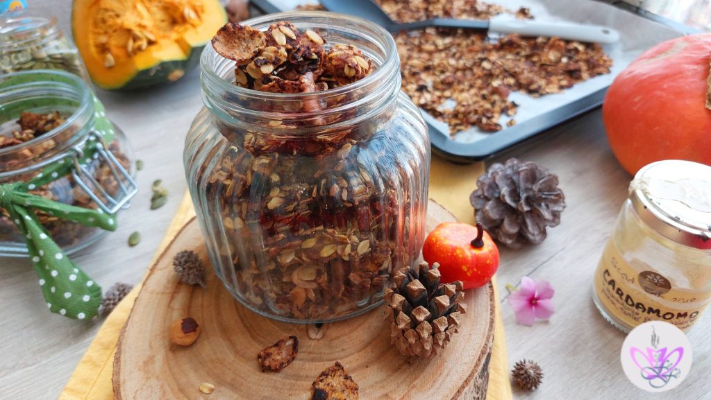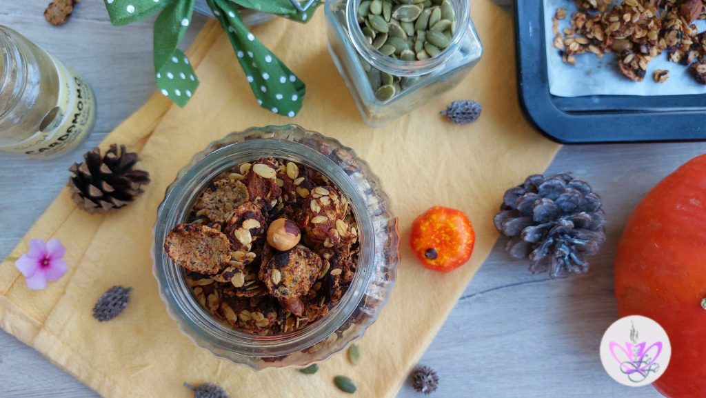 Después del éxito de la granola sin azúcares añadidos, otra versión que espero sea apreciada es esta de otoño con calabaza, de sabores especiados y envolventes, perfecta para el desayuno enriqueciendo tu yogur o como merienda como snack. Una vez más, la elección recae en la preparación casera para evitar todos esos ingredientes industriales y de baja calidad de los que, lamentablemente, los productos comerciales están llenos, como aceites hidrogenados, jarabe de glucosa, azúcares y grasas saturadas. El tiempo para realizar esta granola, por otro lado, es realmente poco, basta con mezclar todos los ingredientes en un bol y extenderlos en una sola capa sobre una bandeja. Aquí, el único inconveniente es tener que cocer previamente la calabaza antes para reducirla a puré, un paso obligado, pero valdrá la pena por sabor y calidad nutricional. La calabaza, de hecho, es una verdura muy beneficiosa, versátil, hipocalórica y digerible. Por eso, su uso más frecuente en la mesa siempre es un buen propósito para garantizar todos los nutrientes y antioxidantes que necesitamos. Disfruta de esta granola también fuera de casa como un tentempié, pero recuerda, los expertos recomiendan una porción de aproximadamente 40 gramos al día, equivalente a aproximadamente 4 cucharadas. Esta cantidad permitiría disfrutar de sus beneficios sin exceder el aporte calórico diario, especialmente para quienes siguen una dieta controlada o buscan mantener su peso.
