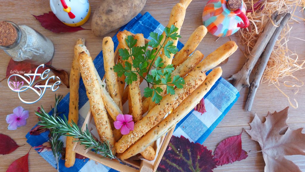 Y después del éxito del pan de patatas, ¡no podía dejar de preparar también los grissinos con patatas! De hecho, estos grissinos no son como los clásicos a los que estás acostumbrado con harina y levadura de cerveza. Sin embargo, son crujientes y sabrosos como los tradicionales, de hecho, los encuentro aún más irresistibles, ya que en la masa tienen patatas, muchas hierbas aromáticas y, por tradición siciliana, también buen sésamo en la superficie. Se preparan realmente muy fácilmente, la única precaución es manipular la masa cruda con delicadeza para que no se rompa, y disfrutarlos de inmediato, apenas cocidos, porque al día siguiente pierden bastante de su crujiente, ¡como todas las preparaciones genuinas! Pero son tan buenos que se acabarán en un santiamén, pero si sobran, no te preocupes, te dejo un truco para que vuelvan a ser crujientes como antes. Dicho esto, te digo que hacer tus grissinos será un juego de niños, ¡incluso divertido! Todos pueden intentar hacerlos, incluso aquellos que no son muy hábiles, ¡ya que no se necesitan técnicas de trabajo especiales, solo un poco de buena voluntad y un toque de paciencia! Te los propongo con perejil y romero, pero nada te impide personalizarlos según tu gusto con otras hierbas aromáticas o especias al gusto. Serán perfectos para añadir a la cesta de pan en la mesa o para picotear con embutidos y quesos durante el aperitivo. ¡Pruébalos, verás qué delicia!