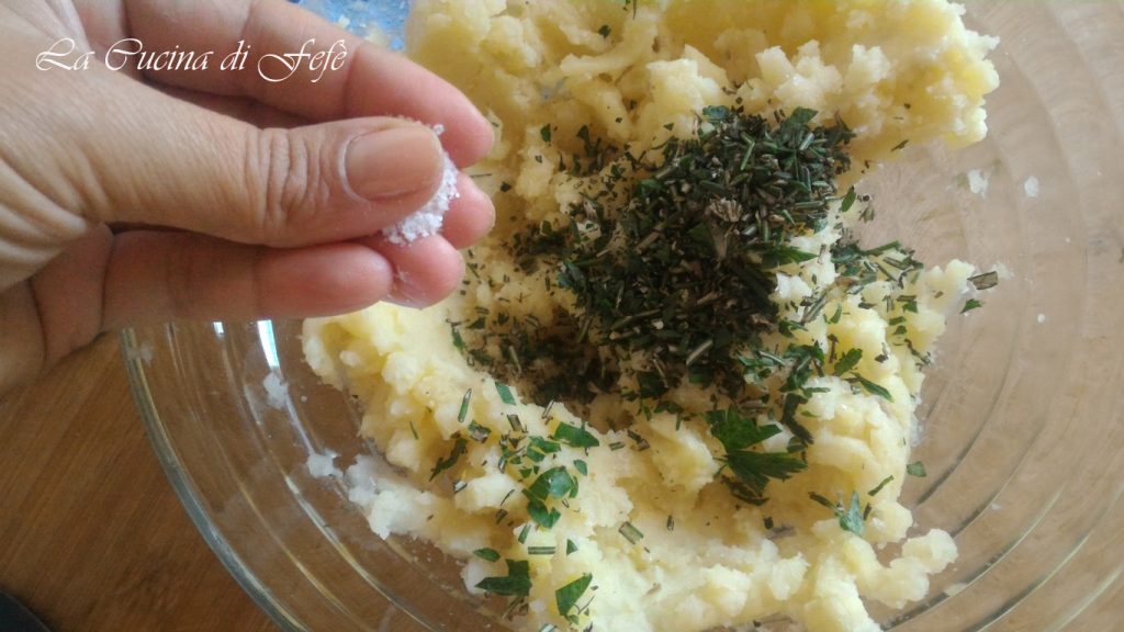 Agrega la picada a las patatas aplastadas, sala y pimienta al gusto.