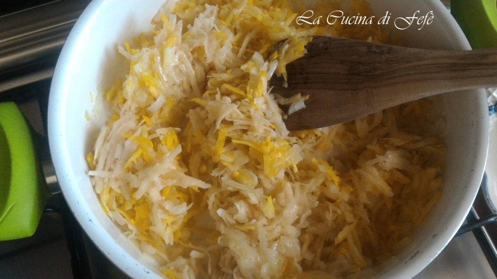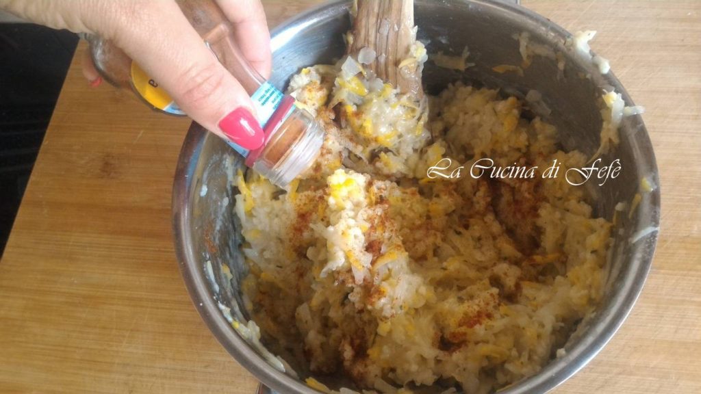 • Después de un par de minutos, agreguen también el calabacín y las patatas ralladas.