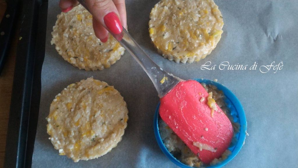 • Con la ayuda de un aro de cocina Ø 8,5 crean hamburguesas no demasiado altas, máximo 1,5 cm, compactándolas bien con una espátula y colocándolas directamente en una bandeja de horno forrada con papel de horno.