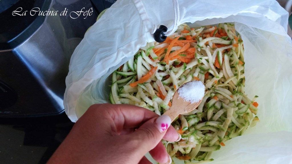 • Salar y dejar reposar en un colador durante 20’ con una bolsa de filtro como hice yo o un paño limpio y preferiblemente no tratado con suavizantes, para que pierdan todo su agua de vegetación.