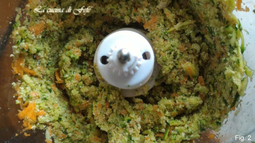 • Lavad, pelad y cortad los extremos de los calabacines y la zanahoria. Con la ayuda de un robot de cocina, triturad finamente o, alternativamente, rallad a mano con un rallador de agujeros grandes.