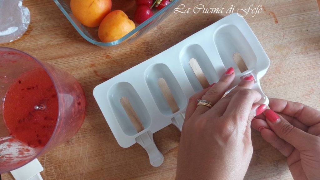 • Introduce delicadamente los palitos de madera en la ranura correspondiente de los moldes para helados.