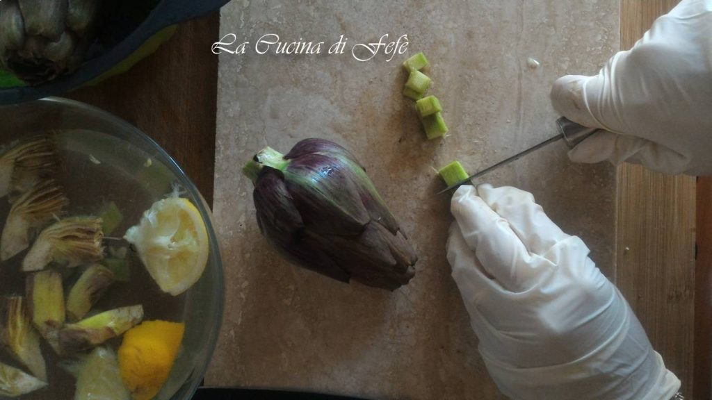 Mientras tanto, ocúpate de las alcachofas: en un cuenco grande, preparad agua acidulada con zumo de limón, que servirá para evitar que se oxiden al contacto con el aire. Luego, con un cuchillo, separad los flores de los tallos eliminando la capa exterior de estos últimos, que es particularmente coriácea.