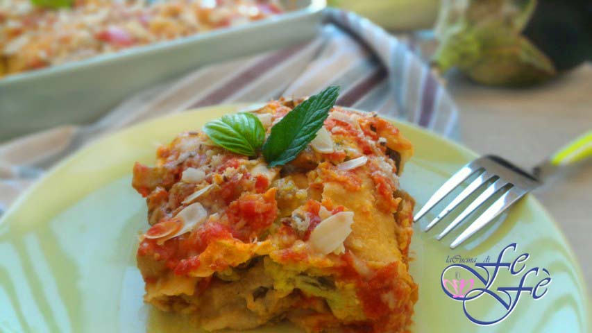 Y por fin, después de varias vicisitudes y pausas vacacionales, he logrado escribir la receta de mis lasañas revisitadas de pan carasau! Revisitadas porque, obviamente, como ya me conocéis, no sé replicar un plato sin dejar mi huella personal. Además, la receta original, según me han contado, ya que yo en Cerdeña no he tenido la oportunidad de poner un pie, está a base de salsa, bechamel y carne picada. Ahora bien, aunque creo que puede ser realmente deliciosa, desafortunadamente no se adapta a mis necesidades alimenticias. Así que me puse manos a la obra y debo decir que lo que temía que fuera un fracaso total, ¡resultó ser una revelación sorprendente! Una textura agradable y suave gracias también a la idea de sustituir la bechamel por un pesto de calabacín, que deliberadamente dejé grueso para darle una sensación crujiente al paladar, la de las almendras en su interior, ¡que os aseguro os conquistará! A este pesto muy delicado, añadí también un poco de salsa de tomate cherry, para darle color al plato y darle el aspecto estético típico de la lasaña, pero sin sobrecargarlo con una salsa de carne clásica, que, entre nosotros, me parecía completamente inapropiada en verano. Todo ello en estilo vegetariano con verduras, y específicamente calabacines, berenjenas y algunos tomates aquí y allá, mucho albahaca y menta y una capa final con almendras laminadas para el gratinado final. No pretendo ofender a los sardos por haber alterado demasiado la esencia de este plato, que temo no podrá ser reconocido como típico sardo, porque creo que lo único sardo que tiene es el pan carasau. En cualquier caso, si tampoco habéis estado en esta hermosa isla, podréis encontrar este producto tradicional sardo ya bastante fácilmente en los hipermercados y supermercados más surtidos. Probadlas y luego escribidme para hacerme saber.