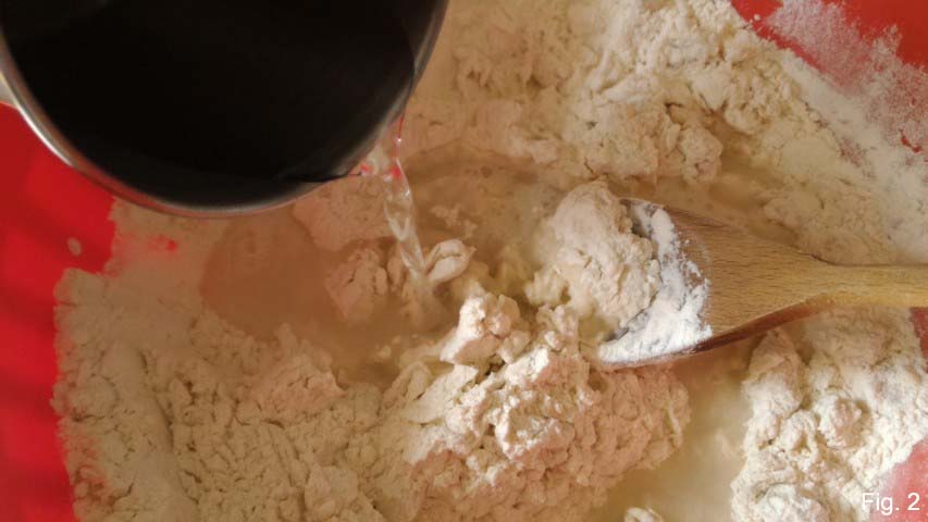 • Mezcla todo con una cuchara de madera, luego añade el agua restante poco a poco, para que puedas regularte si necesitas más de 250 ml o menos (fig. 2).