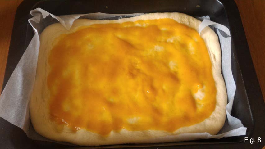 • En este punto, podrás estirar cada masa directamente en las bandejas – previamente untadas y cubiertas con papel de horno – presionando ligeramente con las yemas de los dedos para extender lentamente la masa y hacerla adherir a tu bandeja, o extenderla con el rodillo en la superficie de trabajo enharinada para obtener discos delgados o según tu gusto. Las 2 bases estiradas, finalmente, antes de ir al horno, deberán ser cubiertas con un paño limpio durante otros 30′ para una segunda fermentación (fig. 7).