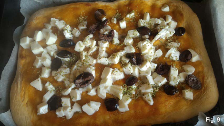 • Añade también aceitunas sin hueso si te gustan y aromas. Baja la temperatura a 200°C y hornea durante unos 25′. Los tiempos de cocción varían de horno a horno, así que te recomiendo que siempre vigiles tu pizza. Unos minutos antes de sacarla del horno, añade la mozzarella en cubitos y deja que se derrita (fig. 9).