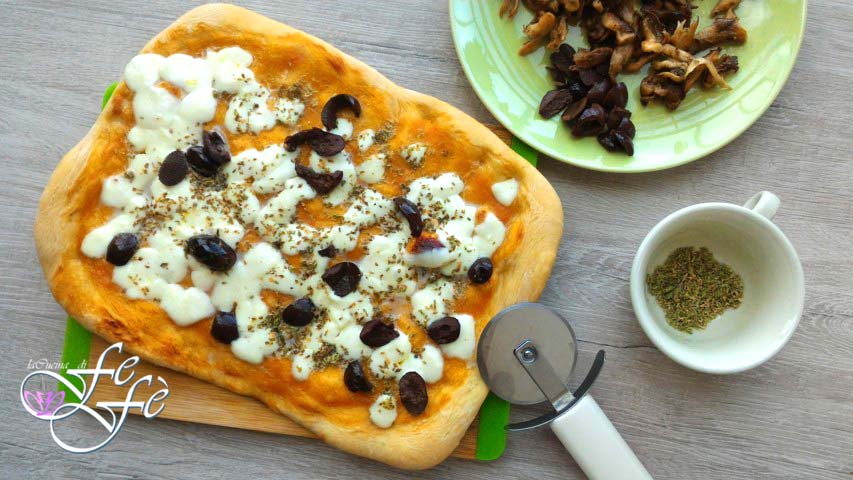 Queridos amigos y amigas, la pizza es un plato que nos representa en todo el mundo, ya que es una expresión de la más alta tradición italiana. A menudo la consumimos fuera, también como expresión de convivencia, pero hoy quiero proponeros la receta para prepararla fácilmente en casa y, en general, con tiempos cortos de fermentación. Yo he preparado la masa rigurosamente a mano, pero con el mismo procedimiento, naturalmente podéis utilizar una amasadora, que sin duda os ahorrará tiempo y sobre todo energía. El uso de harina tipo 0 es el más indicado para este tipo de preparación, pero también podéis hacer una mezcla con otras harinas o combinar una parte de patatas cocidas machacadas junto con harina de sémola de trigo duro – una receta que heredé de mi madre y que pronto os daré a conocer. Para la realización de esta pizza, quiero agradecer a mi marido Giuseppe, que colaboró excelentemente no solo desde el punto de vista fotográfico, sino que también participó activamente durante el estiramiento de la pizza en las bandejas… Porque amasar es divertido, terapéutico y sobre todo relajante, ¿no estáis de acuerdo conmigo?