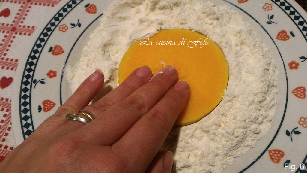 Con un cuchillo retira la piel de cada rodaja, pásalas por harina presionando para que se adhiera por todos los lados y elimina el exceso.