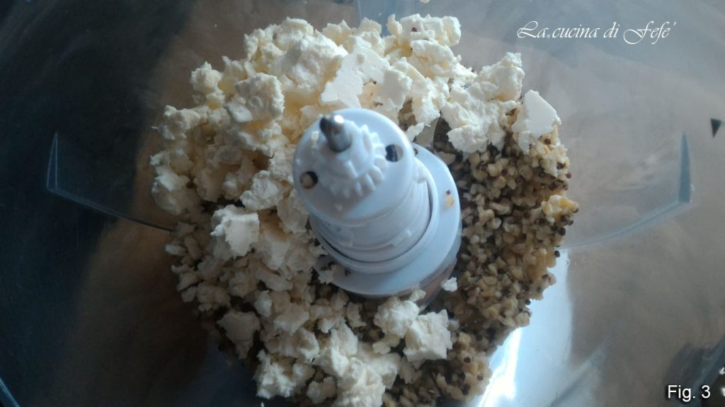 Mientras tanto, en el vaso de un robot de cocina, pon el bulgur y la quinoa previamente cocidos al vapor y bien escurridos* junto con el feta desmenuzado groseramente.