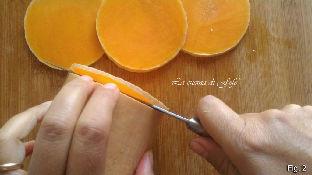 • Cortad también la calabaza en láminas muy finas de aprox. 1-2 mm como máximo.