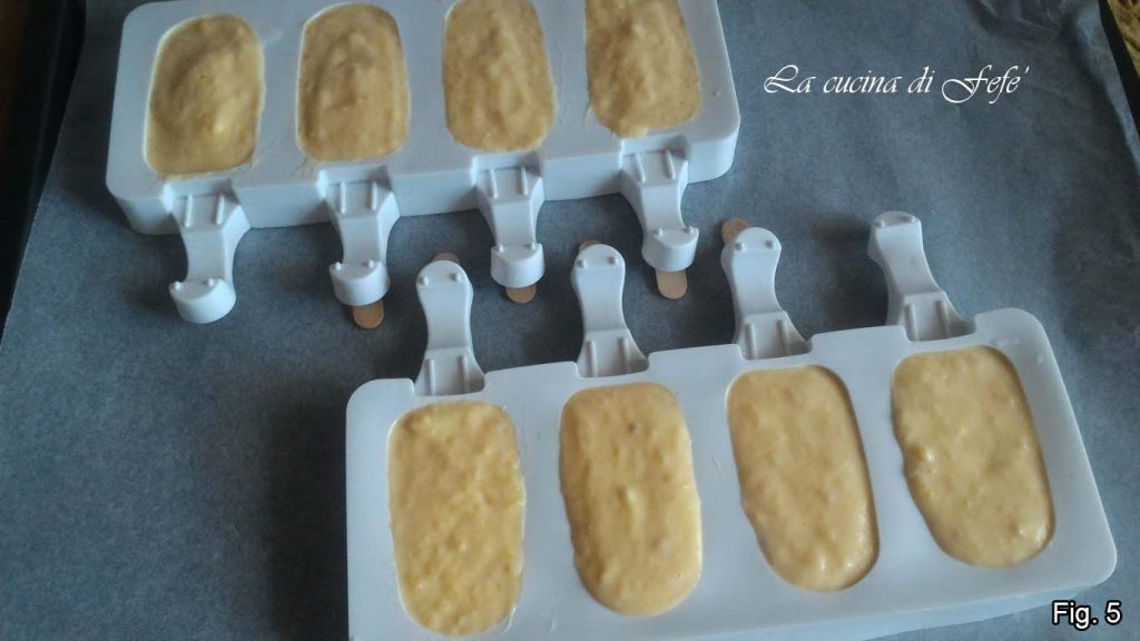 Introduce delicadamente el palito en la ranura apropiada, cubre con más mezcla y nivela ayudándote con una espátula. Coloca los moldes en una bandeja y mete en el congelador por al menos 4 h, pero sería mejor toda la noche.