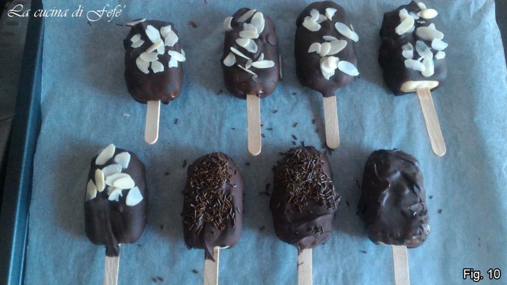 Colócalos en una bandeja forrada con papel para hornear y añade muy rápidamente las almendras en láminas antes de que el chocolate, al contacto con el helado, se endurezca (fig. 9).