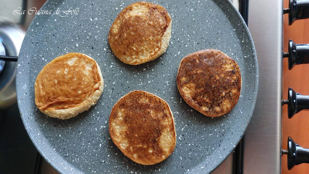 Con la ayuda de una espátula, voltea los pancakes y deja cocinar otros 2′. Procede así hasta agotar toda la masa.