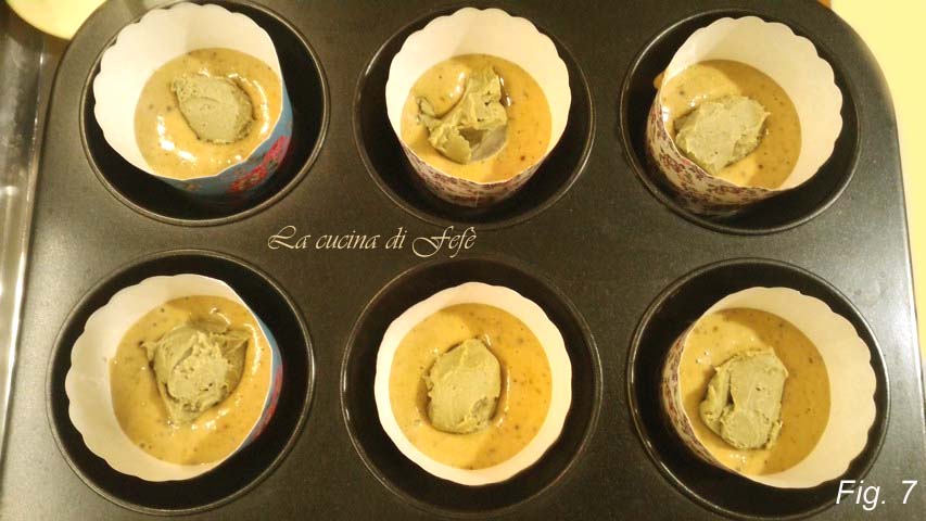 Vierte la masa en los moldes de papel que ya habrás dispuesto en la bandeja para muffins y llénalos hasta 2/3. Coloca en el centro el corazón de crema de pistacho.