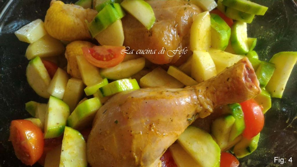 Deja reposar 30′. Mientras tanto, lava y pela las verduras. Corta las patatas y los calabacines en trozos y los tomates a la mitad. Condimenta con 2 cucharadas de aceite, el resto de la cúrcuma, una pizca de sal y una pizca de pimienta (fig. 3).