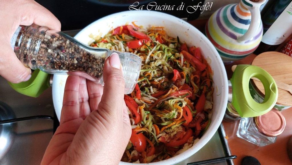 Añade los noodles de calabacines y zanahorias y deja que se impregnen durante otros 2′ añadiendo un cucharón de caldo de verduras caliente solo si es necesario y bajando el fuego.