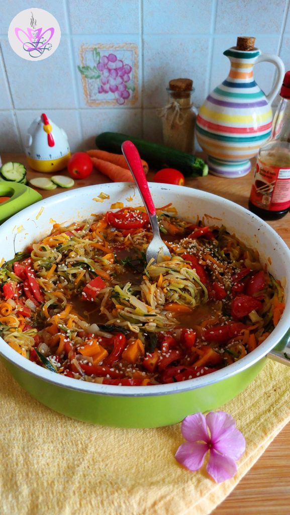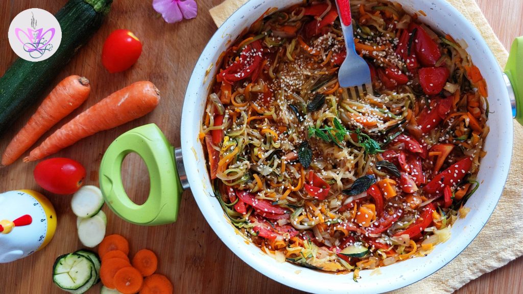 ¡Y voilà… los noodles de calabacines y zanahorias a la sartén están listos para ser disfrutados!