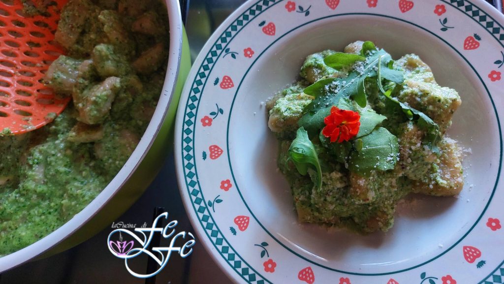 Después de haberos mostrado los últimos días cómo hacer rápidamente unos ñoquis alternativos con calabacines en crudo, aquí tenéis una forma deliciosa de condimentarlos y presentarlos a vuestros comensales. La idea es aprovechar las mismas verduras combinadas con rúcula, para un pesto igualmente alternativo y completo, rico en sabor y con una textura cremosa y al mismo tiempo delicada. Un condimento que se prepara en 5 minutos, considerando el hecho de que también aquí se pone todo crudo en la batidora ¡y listo! ¡Probadlos, porque son increíbles!