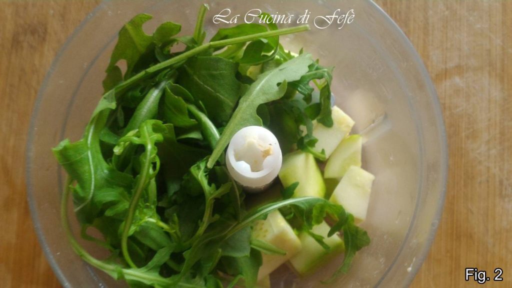 Aparte, en una batidora, colocad la rúcula bien lavada y escurrida y el medio calabacín cortado en trozos (fig. 2). Añadid también las almendras, el pecorino, el grana, el ajo en polvo y una pizca de sal, luego triturad varias veces agregando el aceite en hilo (fig. 3).