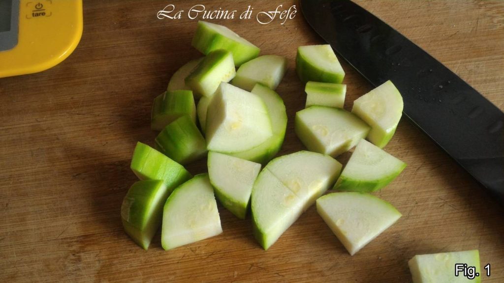 Para preparar los ñoquis de calabacín sin patatas primero lava y corta los extremos de los calabacines y luego córtalos en trozos bastante pequeños (fig. 1).
