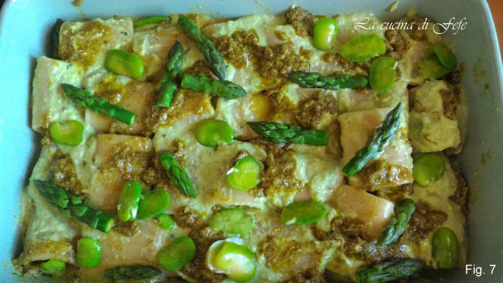 • Cubrid con más pesto de espárragos y robiola y con algunas cucharadas de pesto a la genovesa repartidas aquí y allá.