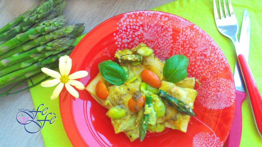 Los paccheri son mi pasión del momento. Después de haberlos experimentado de mil maneras, incluso rellenos como pequeños canelones, hoy quiero proponeros una receta más primaveral, ligera y muy aromática: los paccheri con pesto de espárragos, robiola y habas.