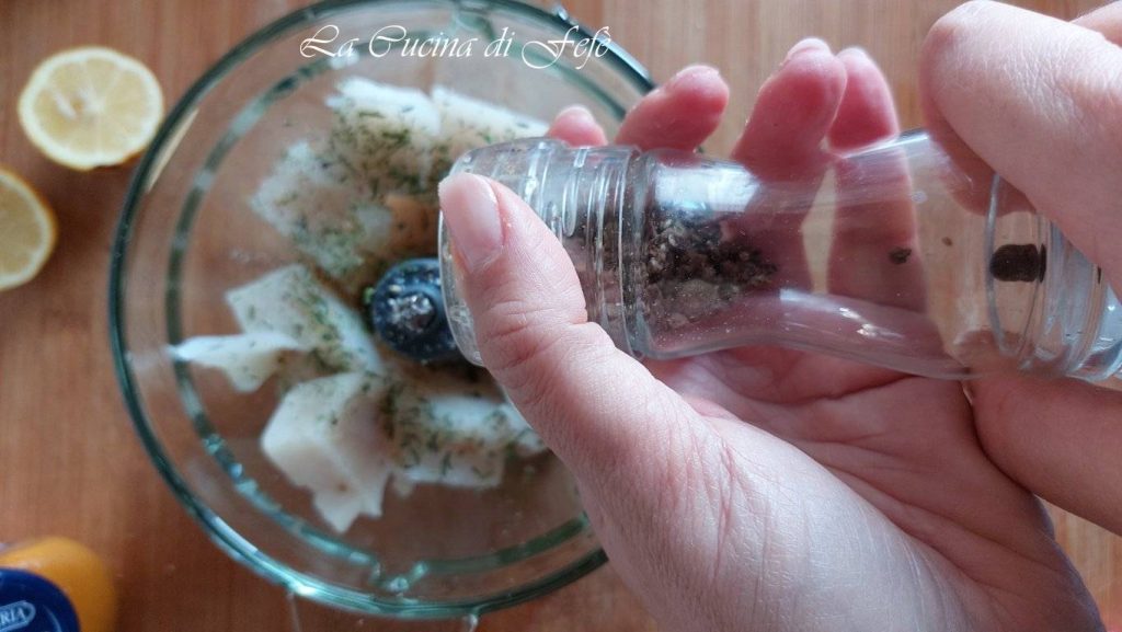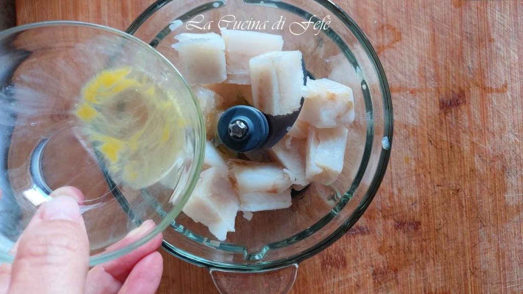 • Transfiere los trocitos de merluza dentro de una batidora y añade la clara de huevo.