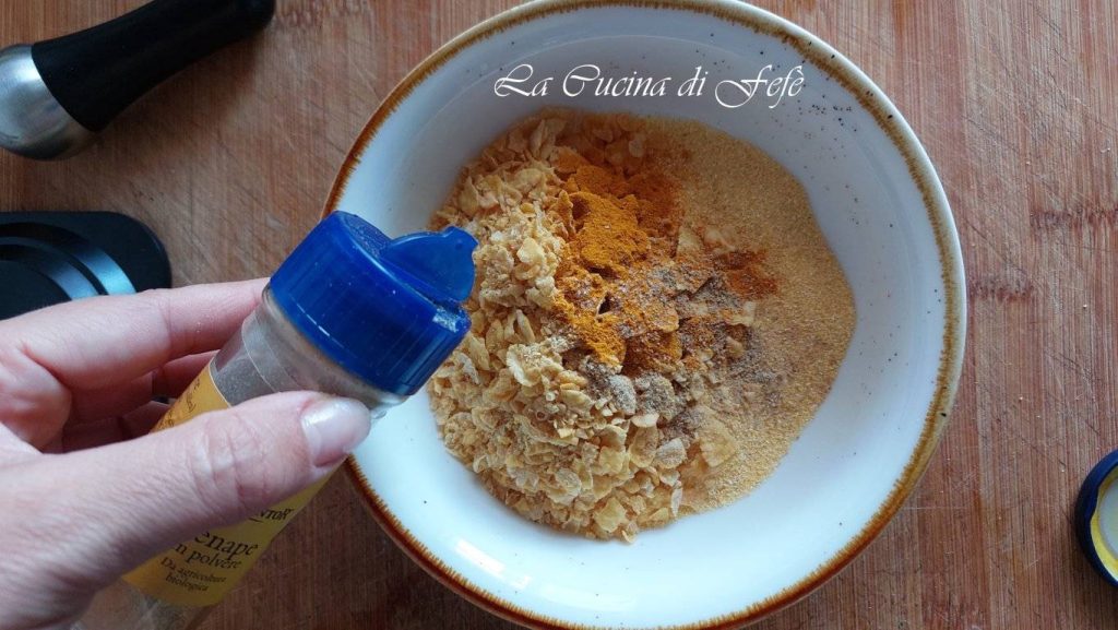 • Únelos a la harina de maíz finísima dentro de un bol grande, luego aromatiza con la cúrcuma y la mostaza en polvo**, un pizca de sal y mezcla.