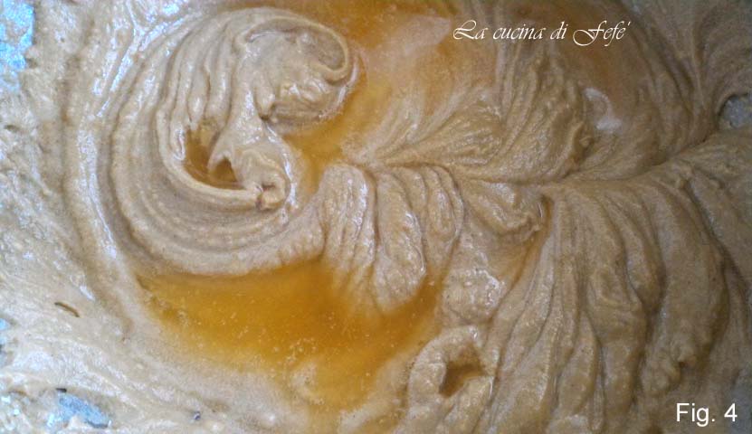 Agregad entonces uno por uno también los huevos a temperatura ambiente, continuando a batir con las varillas eléctricas, luego poco a poco las harinas aromatizadas (fig. 3).