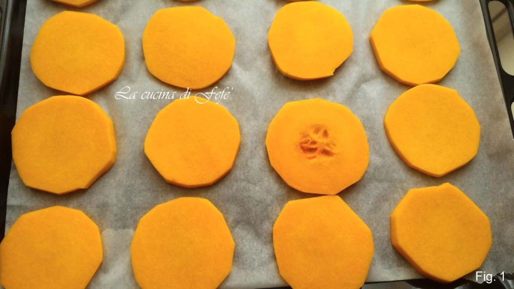 Coloca la calabaza ya limpia en rodajas no muy gruesas en una bandeja forrada con papel de horno y cocina en el horno precalentado a 190°C durante 30′. Una vez secas, debes obtener un peso de aprox. 260 gr. (fig. 1).