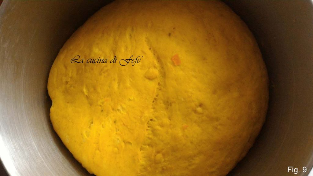 Activa la levadura con la leche libre de la raíz de regaliz, pero no de las semillas de anís, junto con la miel. Luego agrégalo al bol de la amasadora, donde ya habrás añadido la harina, el aceite, el puré de calabaza y 1 cucharada de cúrcuma en polvo (fig. 5).