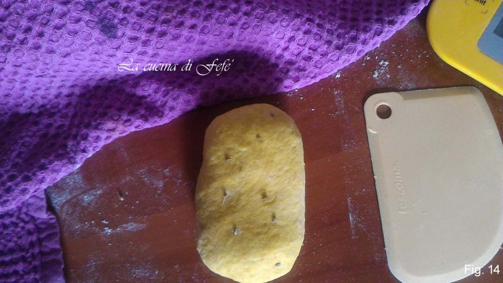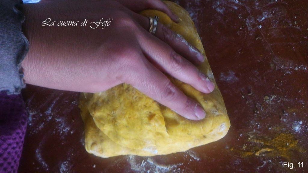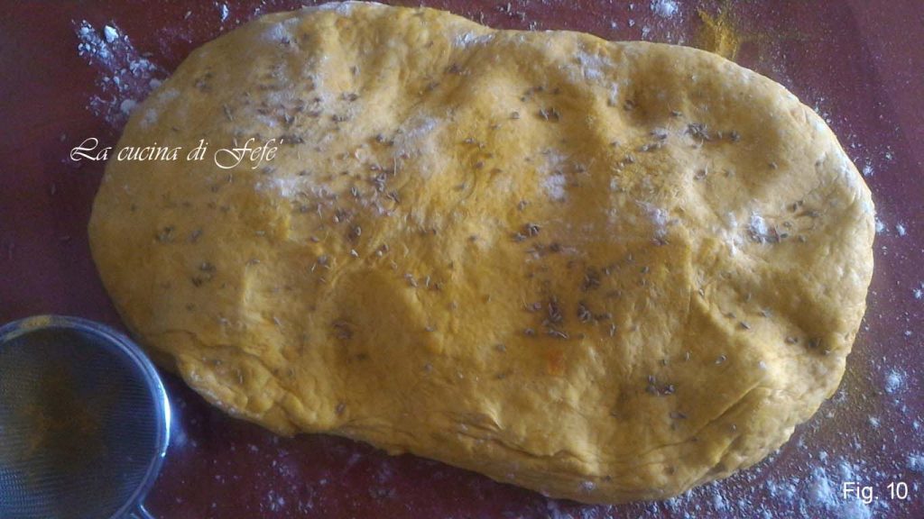 Transfiere la masa a una superficie de trabajo espolvoreada con harina y 1 cucharada de cúrcuma. Extiéndela con las manos, tratando de alargar los bordes y aromatízala con el resto de las semillas de anís (fig. 10).