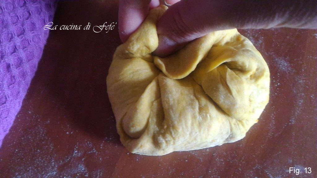 Para cada pieza, lleva los bordes de la masa hacia el centro, girándola en sentido horario continuamente (fig. 13).