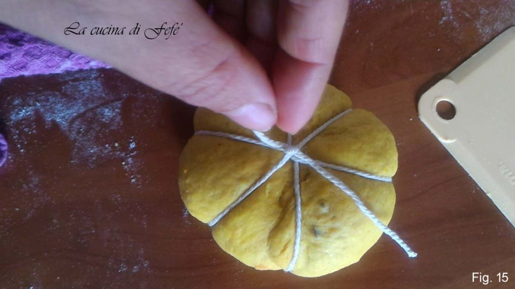 Forma una bolita redonda con cada uno. Átalos con la cuerda de cocina si te gusta la idea de lograr el efecto de calabaza, de lo contrario puedes omitir este paso (fig. 15).