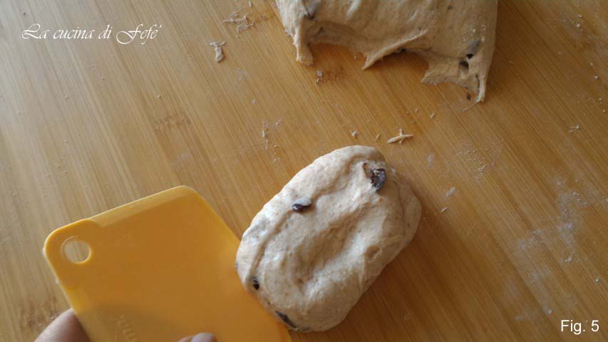 Colócalo en un recipiente previamente enharinado y cubre con un paño limpio. Coloca el bollo dentro del horno apagado con la luz encendida y deja que leude por 2 horas. Pasado este tiempo, el bollo habrá duplicado su volumen, así que trabájalo nuevamente en la superficie de trabajo, tratando de golpearlo enérgicamente 2-3 veces. Luego divide en 8 porciones, formando rectángulos con la ayuda de una espátula (fig. 5).