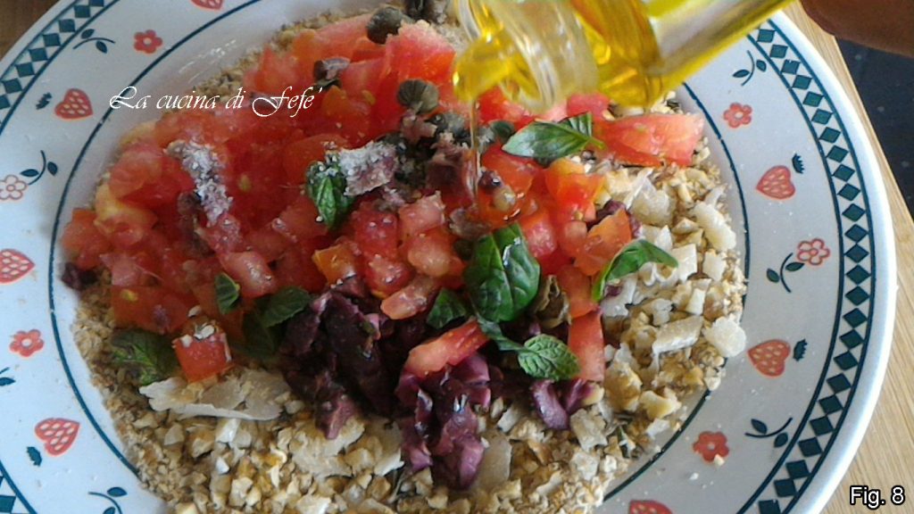 Añade también los tomatitos bien escurridos, las anchoas ligeramente enjuagadas, secadas con papel absorbente y cortadas en trozos, y aromatiza con menta y albahaca picadas (fig. 7).