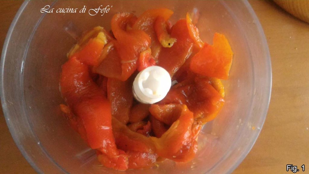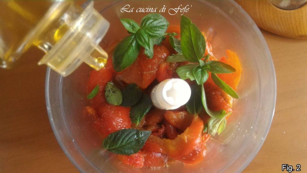 Lava los pimientos, sécalos con papel absorbente de cocina y colócalos en una bandeja forrada con papel de horno. Hornea a 200°C durante unos 40′, dándoles la vuelta a la mitad de la cocción. Apaga, cúbrelos con su propio papel y deja reposar durante 20′, luego pélalos y elimina el tallo y las semillas internas. Coloca la pulpa así limpia en tiras dentro de una batidora.