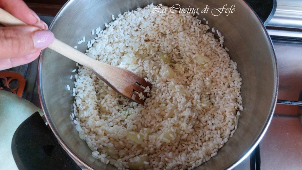 Añade el arroz y tuéstalo durante otros 2′ removiendo continuamente con una cuchara de madera.