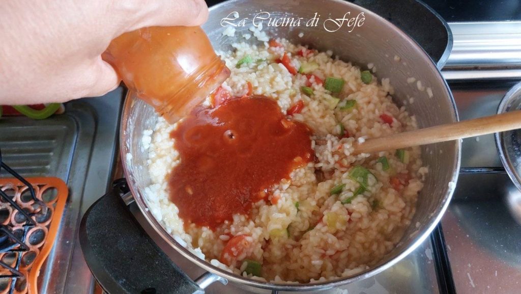 Procede así, añadiendo más caldo solo cuando el anterior se haya absorbido; después de unos 5′ añade las otras verduras y rocía con más caldo siempre bien caliente.