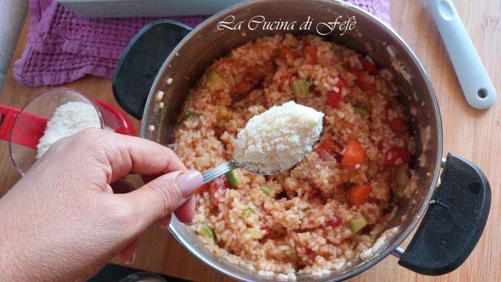 Deja el arroz al dente, porque terminará de cocinarse en el horno. Así que aconsejo interrumpir la cocción unos 3′ antes de los tiempos previstos en tu paquete. Sazona con una cucharada de grana rallado y mezcla.