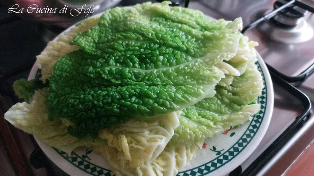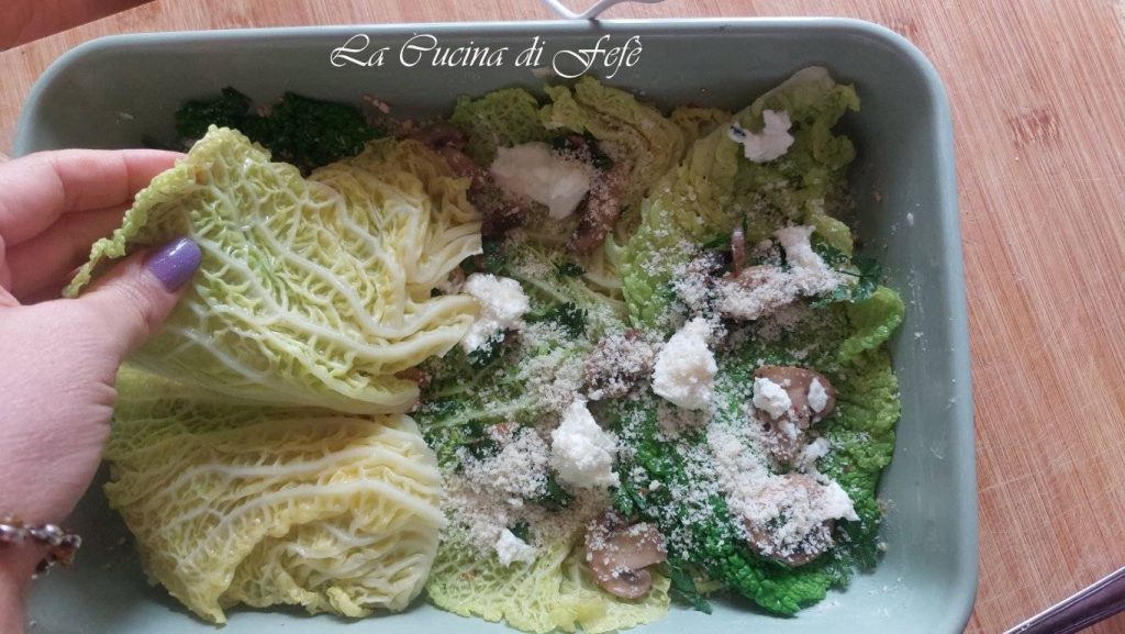Estás listo para componer tu pastel: en una bandeja bien engrasada y espolvoreada previamente con dos cucharadas de pan rallado, coloca una primera capa de hojas de col (alrededor de 3).