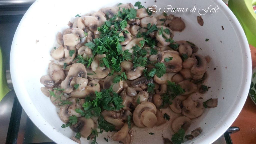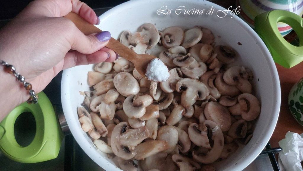 Añade los champiñones ya cortados y deja que se impregnen 3′ a fuego lento, removiendo continuamente con una cuchara de madera.